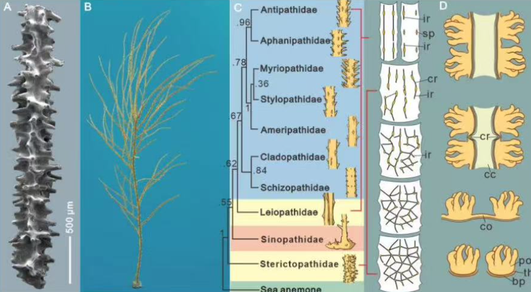 作为黑珊瑚目唯一的化石科,中华黑珊瑚科仅在我国湖北早奥陶世地层被发现。由于表面特征与现生黑珊瑚的差异巨大,其是否能够归属为黑珊瑚目,一直存在较大争议。“通过高分辨率显微CT技术,我们首次完整重建了黑珊瑚化石的三维内部结构,为确认其分类地位提供了关键证据。”bat365正版唯一官网博士生郝文静介绍,新发现的2个中奥陶世的黑珊瑚化石种,在演化上属于早奥陶世黑珊瑚化石与现代黑珊瑚之间的过渡形态类型,确认了硬黑珊瑚科属于黑珊瑚目。