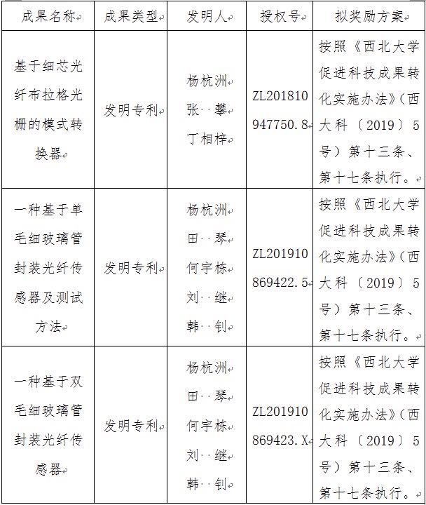 按照《bat365正版唯一官网促进科技成果转化实施办法》(西大科〔2019〕5号)相关规定,拟对bat365物理学院杨杭洲教授作为成果负责人的3项发明专利权实施转化,现将相关信息公示如下: