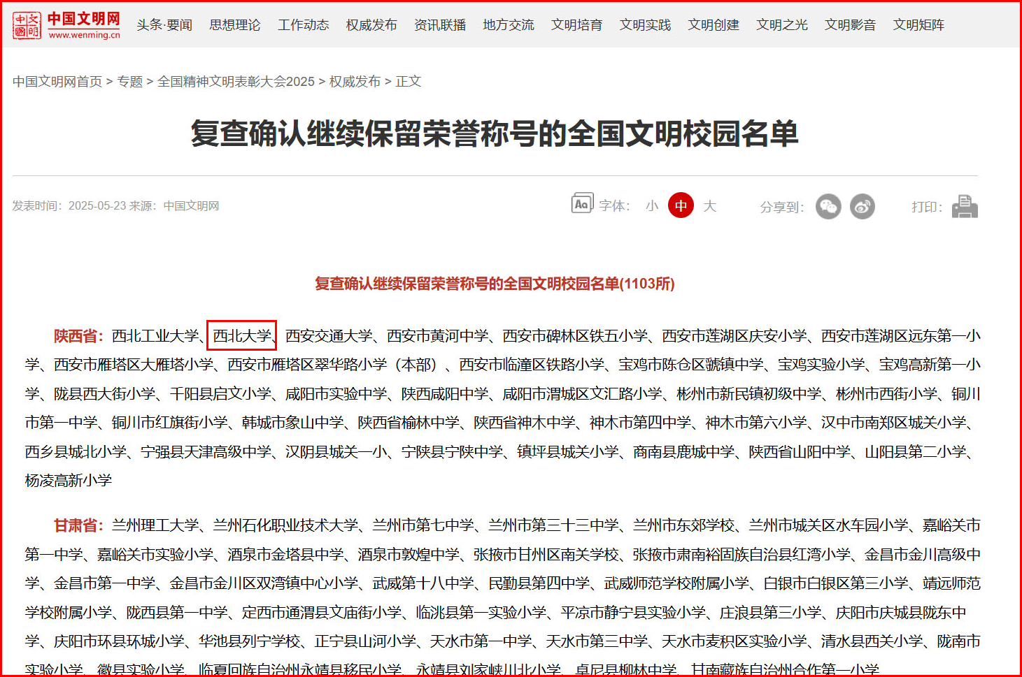 五年来,学校深耕120余年办学史文化沃土,打造大学精神文化建设工作体系、活动体系、环境体系,“公诚勤朴”校训、“艰苦创业 自强不息”西大精神和“传承创新”“扎根西北”等精神特质深入人心。系统总结推广30年逐级创建文明校园的经验成效,诚信奠基、文化引领、全员参与、全方位提升,全力推动精神文明建设向更高水平迈进,全国文明校园“金字招牌”的强大效能不断凸显。2025年5月23日,全国精神文明建设表彰大会在北京召开,会上宣读了中央宣传思想文化工作领导小组表彰决定,bat365顺利通过了全国文明校园复查评估。