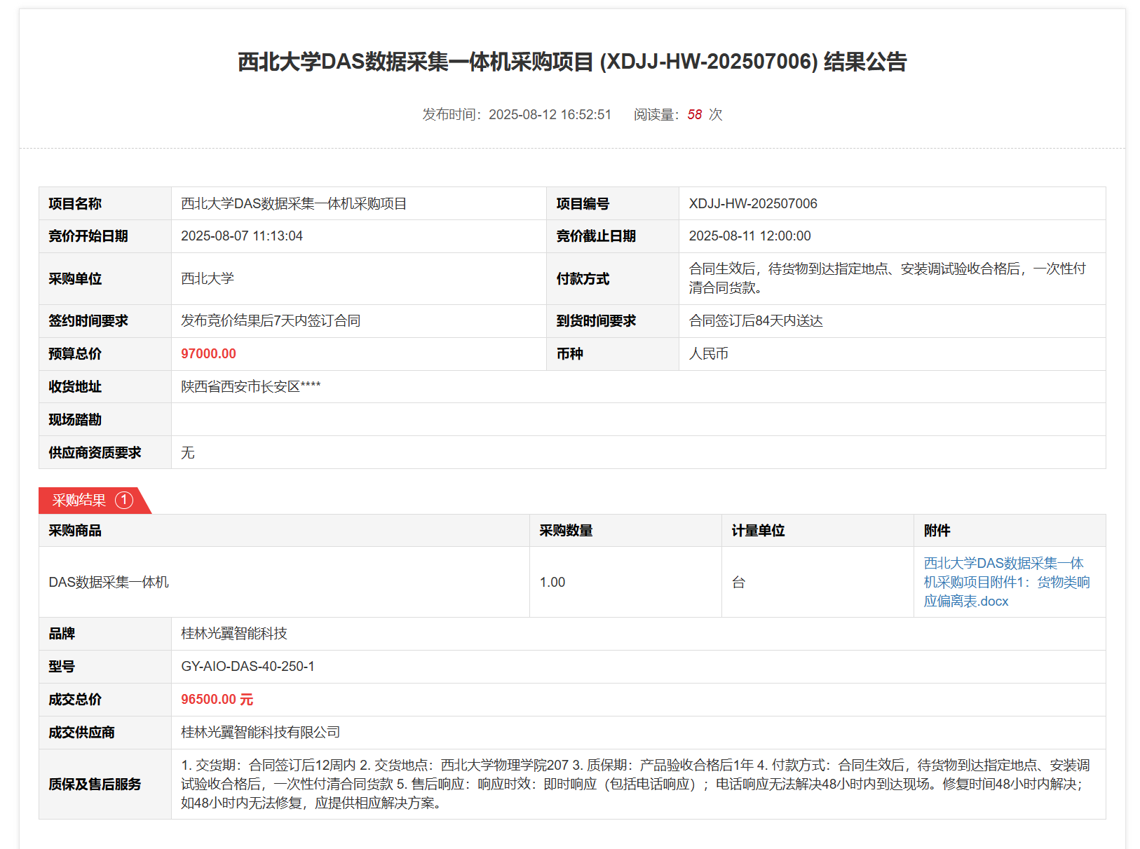 bat365正版唯一官网DAS数据采集一体机采购项目(XDJJ-HW-202507006)竞价结果公告