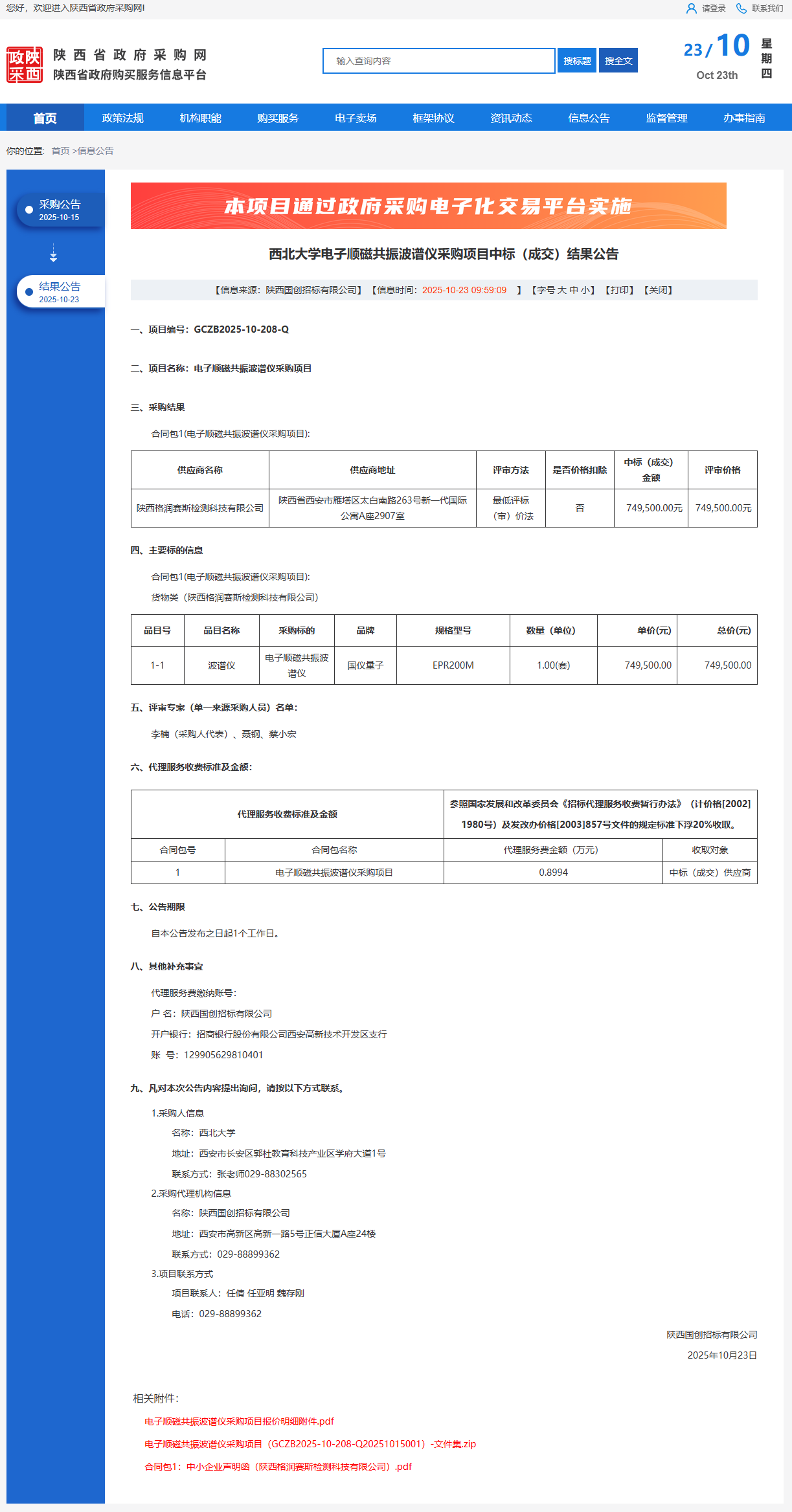 bat365正版唯一官网电子顺磁共振波谱仪采购项目中标(成交)结果公告