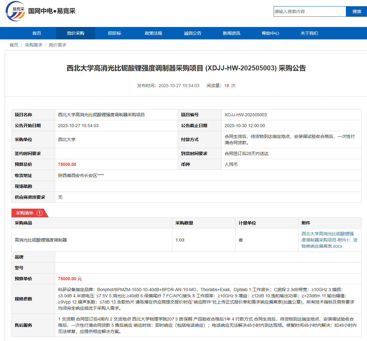 bat365正版唯一官网高消光比铌酸锂强度调制器采购项目(XDJJ-HW-202505003)竞价采购公告