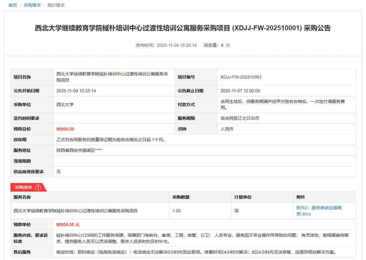 bat365正版唯一官网继续教育学院棫朴培训中心过渡性培训公寓服务采购项目(XDJJ-FW-202510001)竞价采购公告